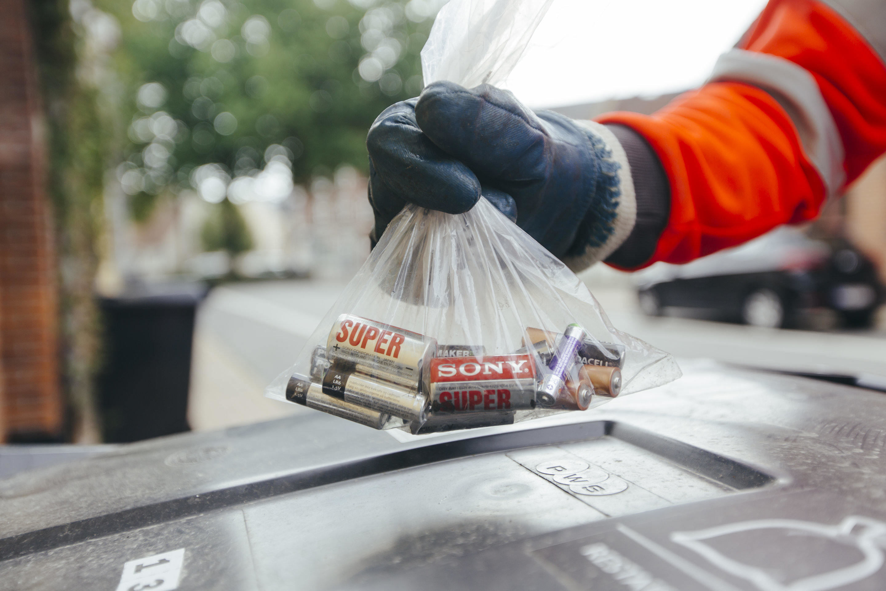 - I de boligforeninger, som har almindelige affaldsbeholdere på 2 hjul, kan batterierne samles i en klar plastpose og lægges på affaldsbeholderens låg på tømmedagen.