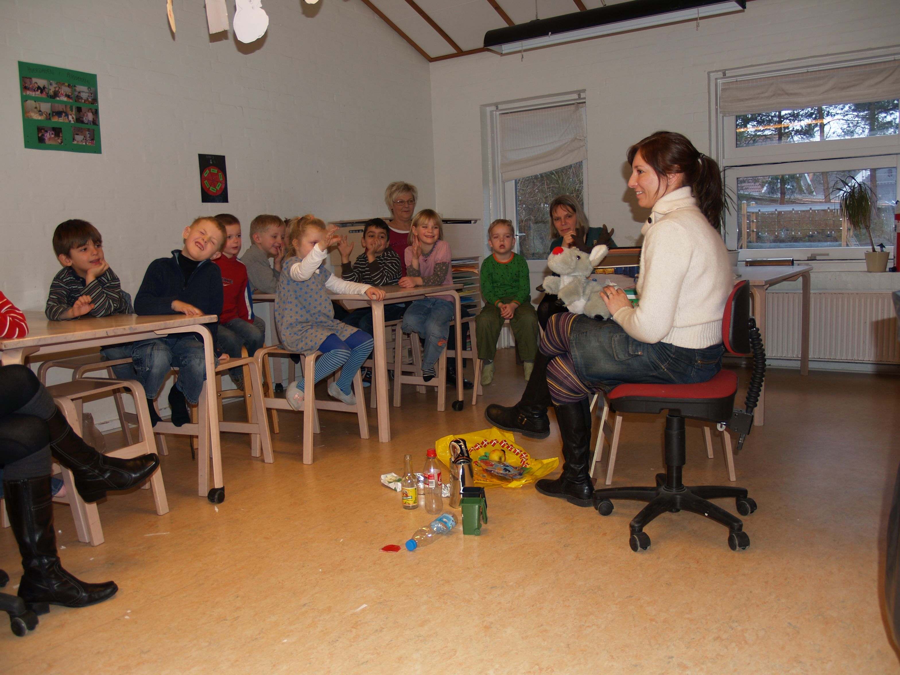 Med udgangspunkt i børnebogen taler vi om affald, natur og materialer. Vi kigger på, rører ved og taler om affald for at få indblik i begreber som genbrug og miljø. Alle børnene får deres eget eksemplar af bogen med hjem, så de kan læse den igen og igen med forældrene.