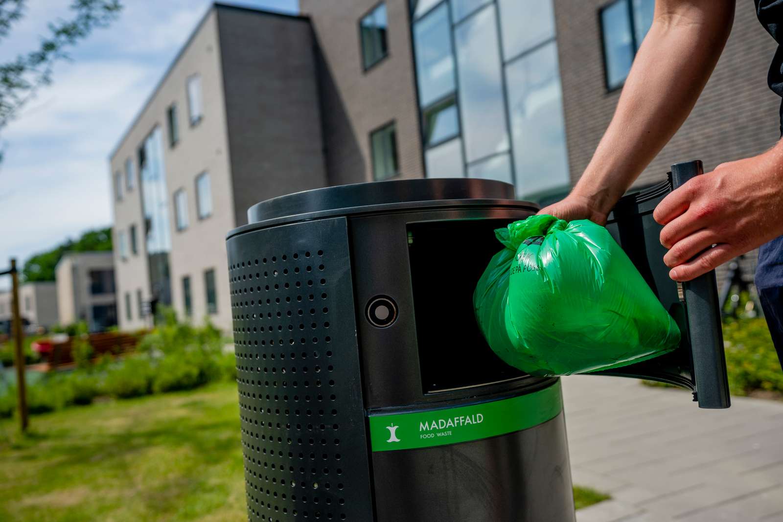 - Madaffald afleveres i indkast tilkoblet affaldssug, placeret uden for bygningen. Skal i poser.